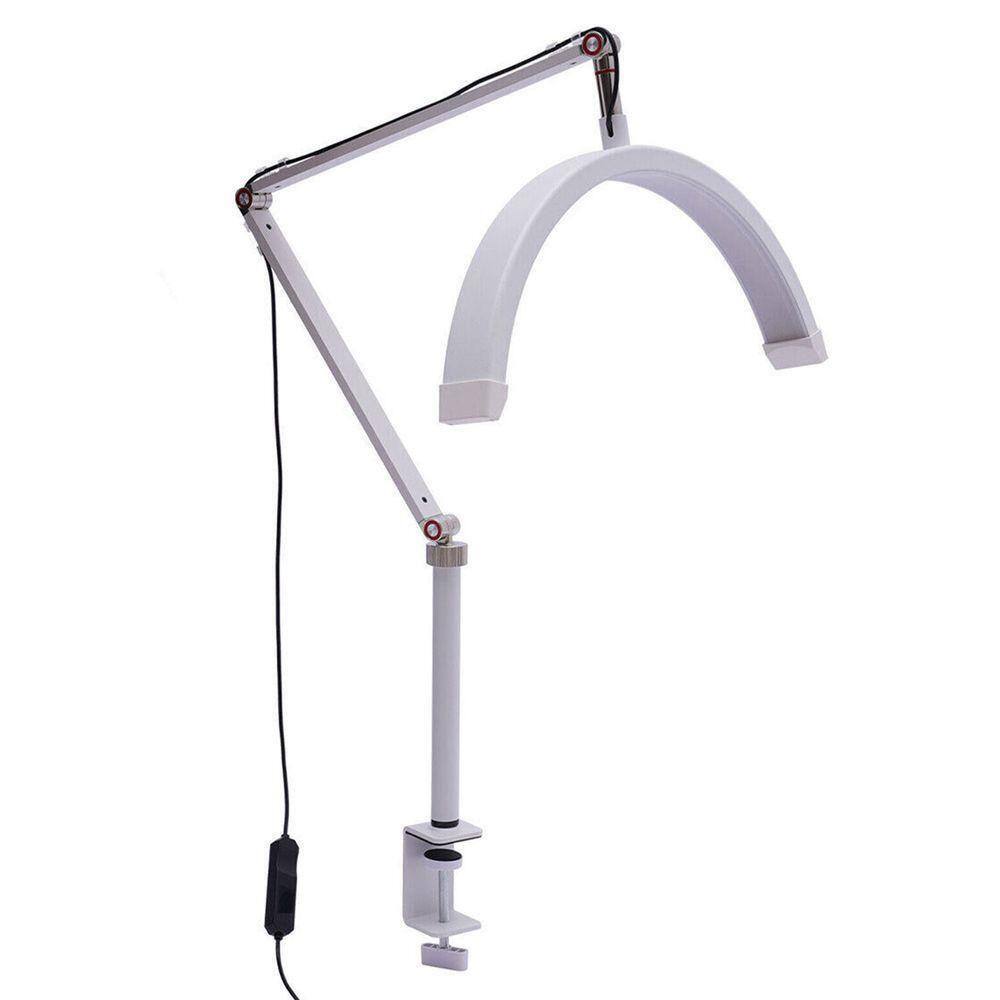 Seu design semicircular em formato meia-lua envolve a área de trabalho, distribuindo melhor a luz sobre o rosto, unhas ou pequenos objetos. Isso garante maior qualidade em procedimentos e gravações, evitando sombras indesejadas.