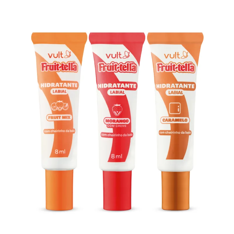 São três sabores do Hidratante Labial Vult&Fruit-tella®: Caramelo, Morango com Creme e Fruit Mix. Uma explosão de aromas e hidratação para seus lábios, com o cheirinho nostálgico da bala Fruit-tella® que você ama! Ideal para ter sempre na bolsa e variar o sabor de acordo com o seu humor.